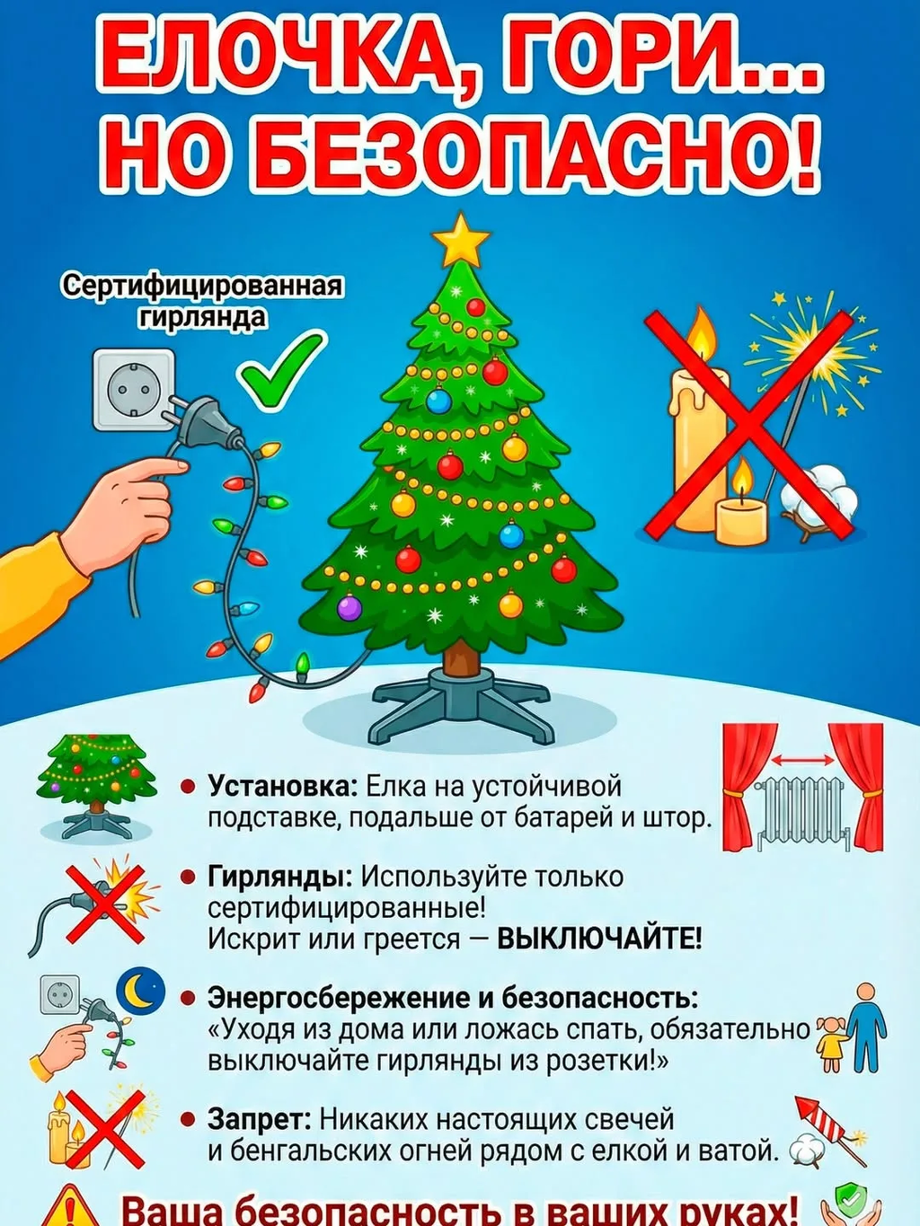 - Безопасность с огнем: Правила обращения с новогодними гирляндами, свечами, а также категорический запрет на самостоятельное использование пиротехники.