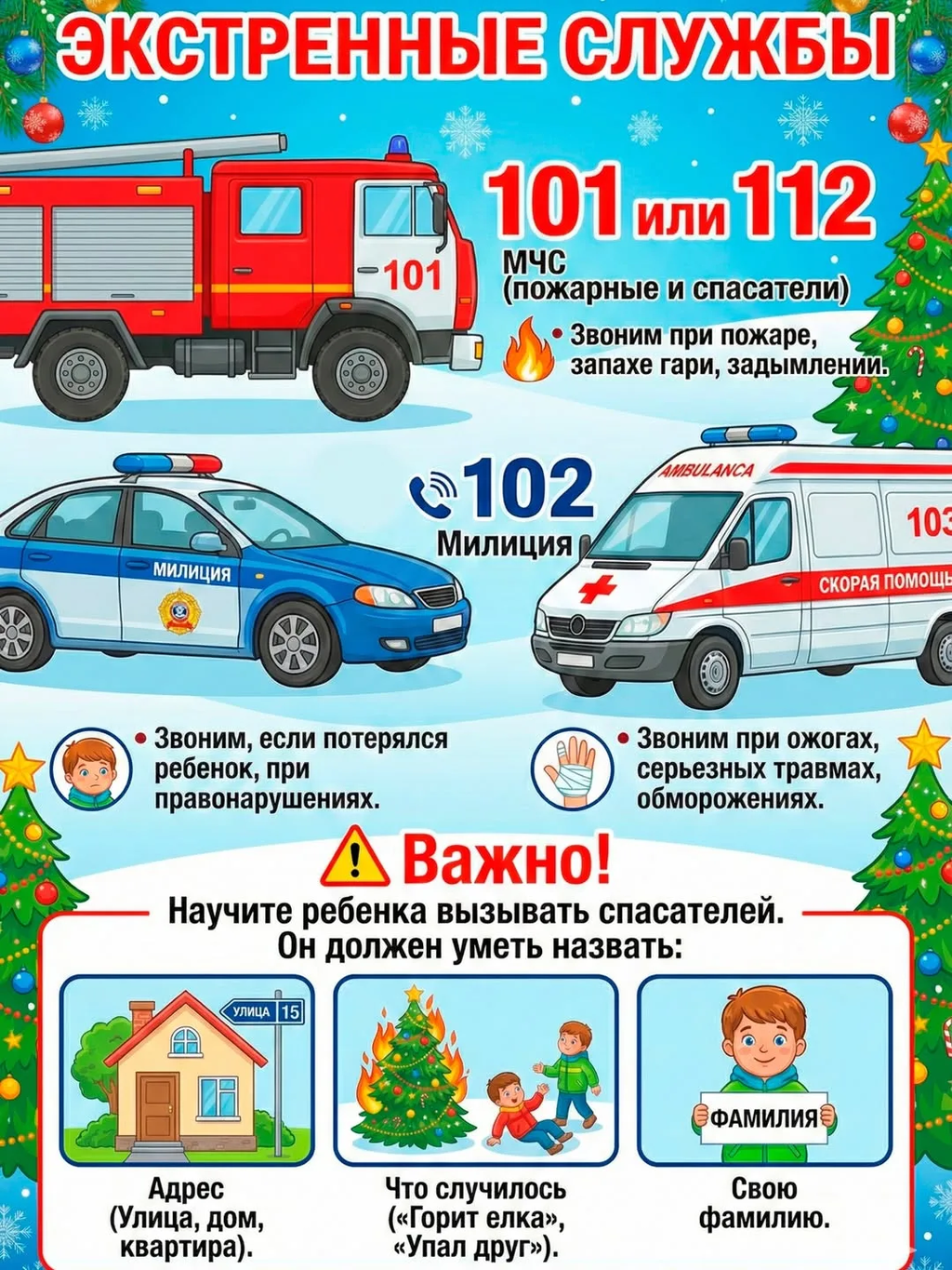 Чтобы сказка не обернулась трагедией, мы подготовили для вас и ваших детей основные правила безопасного поведения в период новогодних праздников. Эти простые, но жизненно важные рекомендации собраны на специальных карточках, которые помогут вам в доступной форме донести до ребенка, как вести себя в различных ситуациях, чтобы праздник оставался праздником.